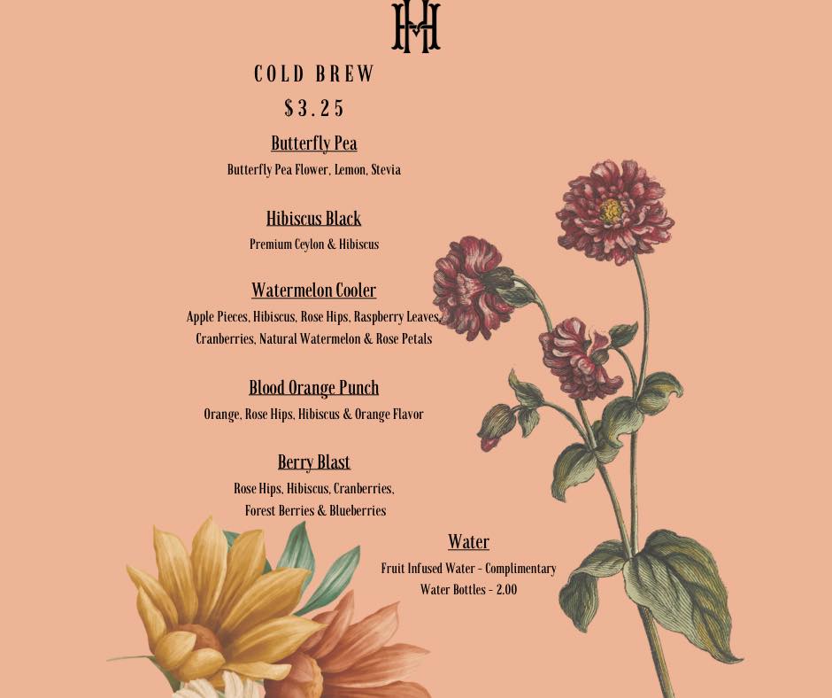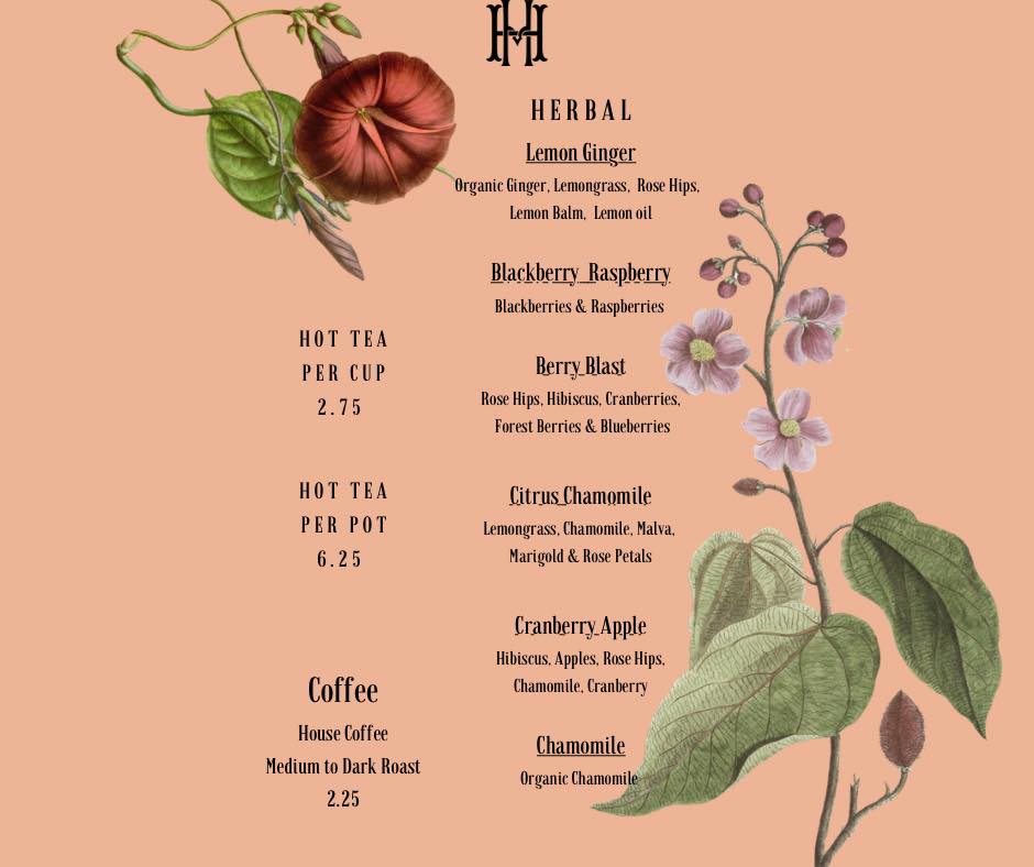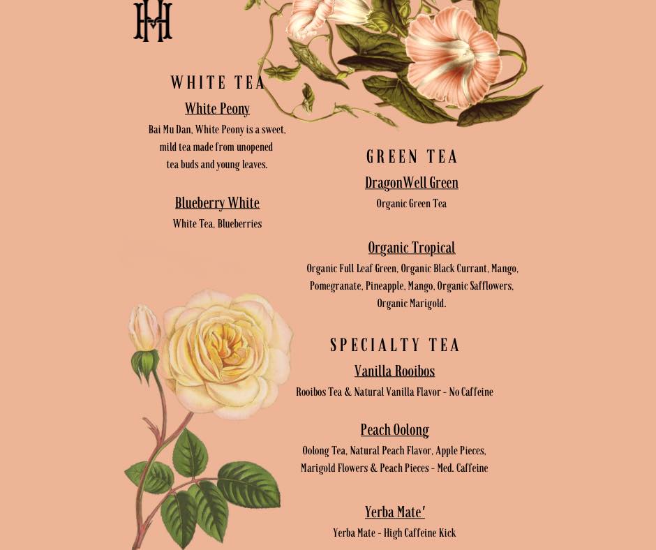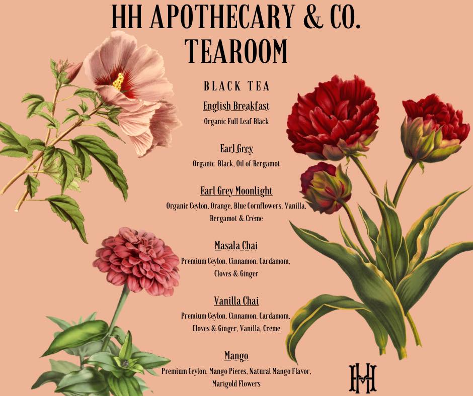 From a reviewer's perspective, the menu at Hh Apothecary & Co. - The Lafleur Building offers a meticulously curated tea experience that highlights both variety and sophistication. Tea enthusiasts will find a rich selection of black teas, including Assam Black Tea, Ambrosia Black Tea, April In Paris Black Tea, Black Cherry Black Tea, and Blackberry Black Tea, each offering its own distinctive depth and aroma. For those who prefer something lighter, the green tea options-Genma Cha Green Tea, Ginseng Green Tea, Gunpowder Green Tea, Jasmine Green Tea, and Lemon Meringue Green Tea-bring a refreshing balance of floral and earthy notes. The red teas, Rooibos and Vanilla Rooibos, provide a naturally sweet, caffeine-free alternative, perfect for a cozy afternoon. White tea aficionados will appreciate the delicate flavors of Bai Mu Dan - White Peony and Silver Needle White Tea, which showcase subtlety and elegance in every sip. Overall, the menu demonstrates a thoughtful commitment to quality and variety, ensuring that every guest can find a tea that resonates with their personal taste. While the offerings are focused on teas, the diversity within each category creates a layered and enjoyable experience, making Hh Apothecary & Co. not just a place to drink tea, but a destination to savor it.